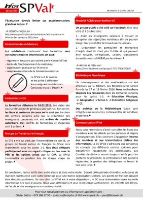 Voici le bulletin d'informations SPVal de janvier 2016. Les points traités sont: - Organisation scolaire 2016-2017 - Economies - ETS2 - Infos FMEP - DFS: Evaluation, Médiateurs, Formation 1H-2H, GT français - Matériel AC&M - Bibliothèque Numérique
