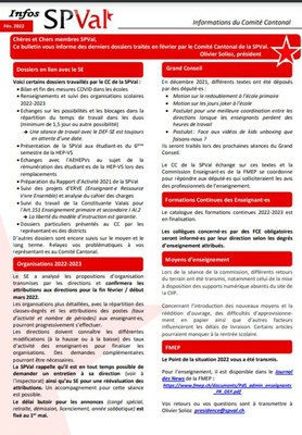 Ce bulletin vous informe des différents dossiers traités par le Comité Cantonal de la SPVal durant le mois de février.