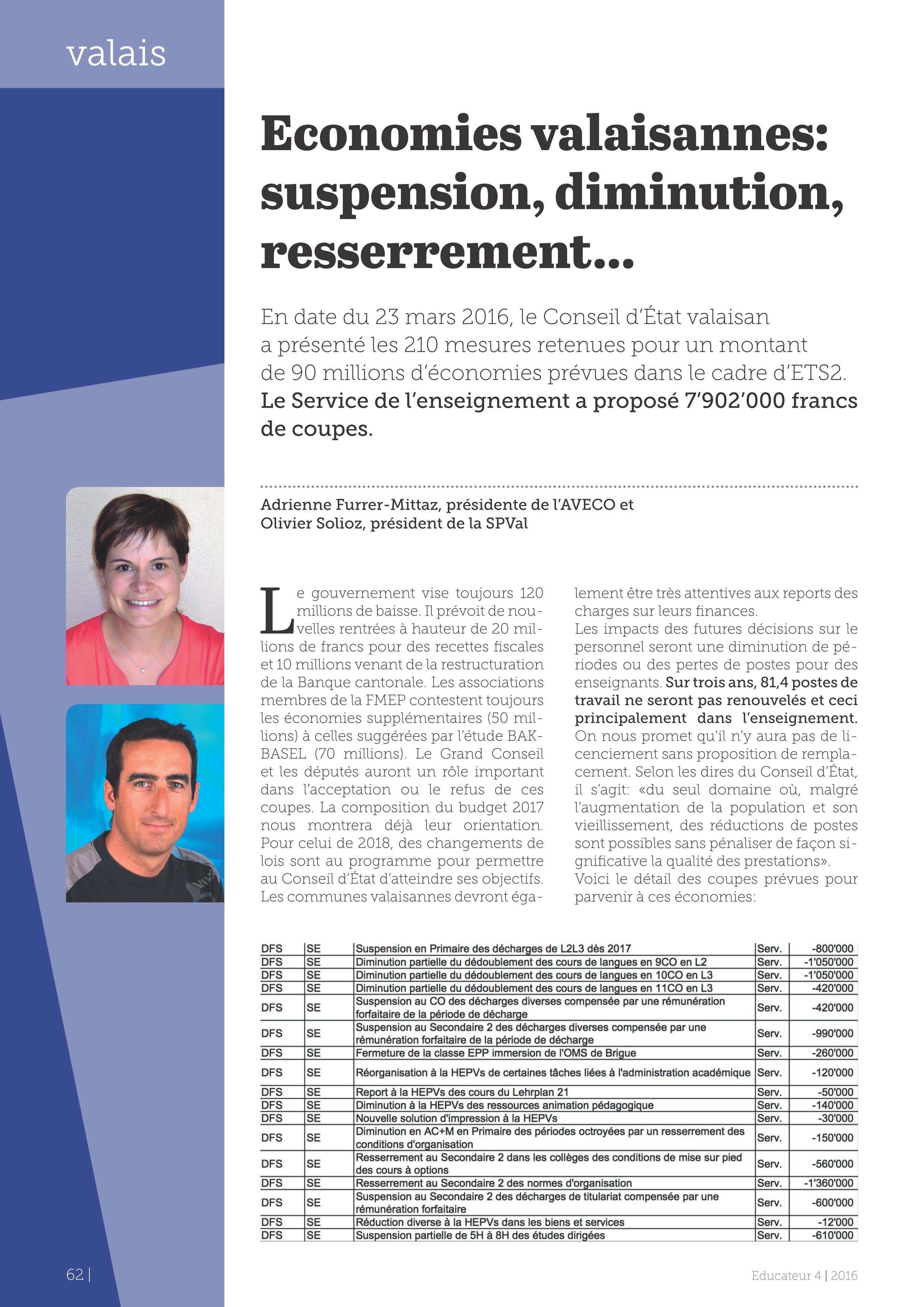 Les associations membres de la FMEP contestent toujours les économies supplémentaires (50 millions) à celles suggérées par l’étude BAKBASEL (70 millions). Le Grand Conseil et les députés auront un rôle important dans l’acceptation ou le refus de ces coupes. La composition du budget 2017 nous montrera déjà leur orientation. Pour celui de 2018, des changements de lois sont au programme pour permettre au Conseil d’État d’atteindre ses objectifs. Les communes valaisannes devront également être très attentives aux reports des charges sur leurs finances.